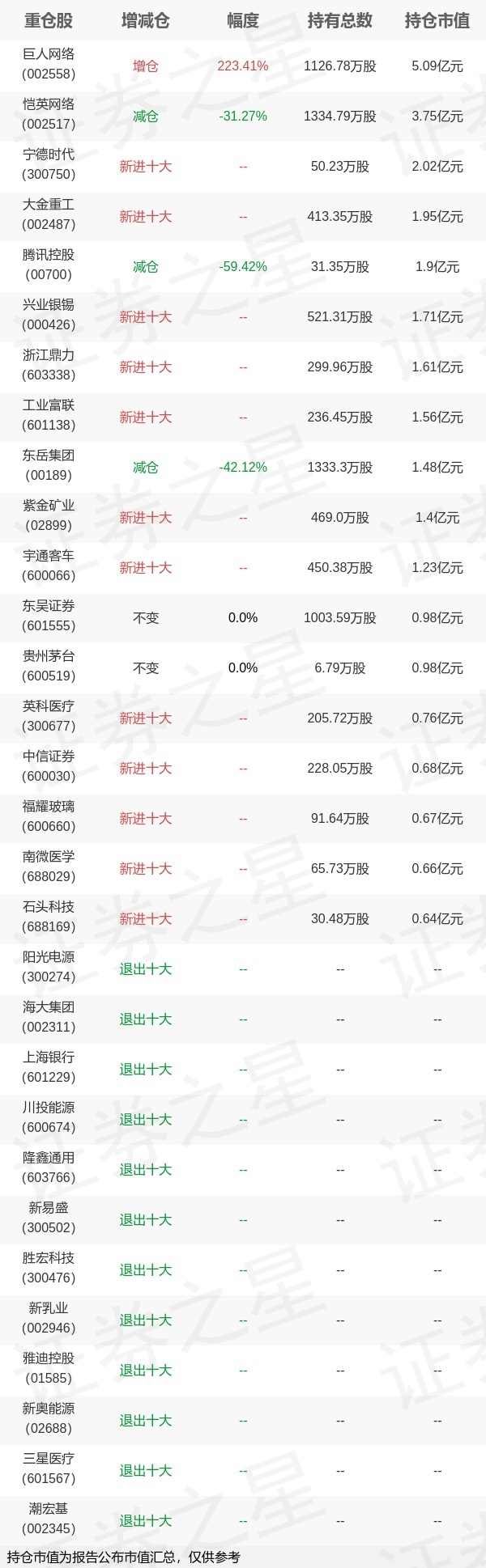 证券之星消息,10月28日华安基金王斌旗下基金公布2025年三季报,综合其旗下各基金报告,港股持仓比重大幅减少,腾讯控股,东岳集团等被减持;另外,新能源汽车行业板块个股更受其关注,与上季度相比,宇通客车、宁德时代等新入十大重仓;充电桩行业板块则遭到减持,三星医疗,隆鑫通用,阳光电源等退出十大重仓;目前其旗下基金综合持仓排名前三个股为巨人网络、恺英网络、宁德时代。
