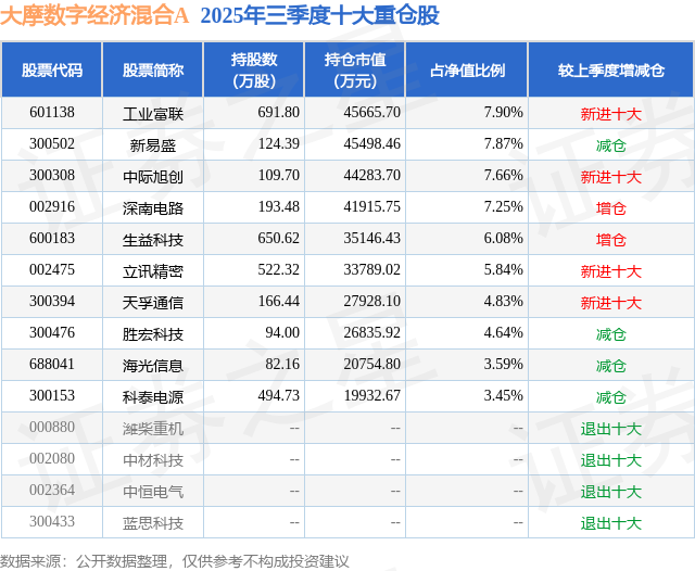 根据2025基金Q3季报公募基金重仓股数据,重仓该股的公募基金共9家,其中持有数量最多的公募基金为摩根士丹利基金的大摩数字经济混合A。大摩数字经济混合A目前规模为33.51亿元,最新净值2.4488(10月27日),较上一交易日上涨4.95%,近一年上涨87.85%。该公募基金现任基金经理为雷志勇。雷志勇在任的基金产品包括:大摩科技领先混合A,管理时间为2019年4月20日至今,期间收益率为137.67%;大摩万众创新混合A,管理时间为2020年5月7日至今,期间收益率为-1.89%;大摩景气智选混合A,管理时间为2025年5月16日至今,期间收益率为30.6%。