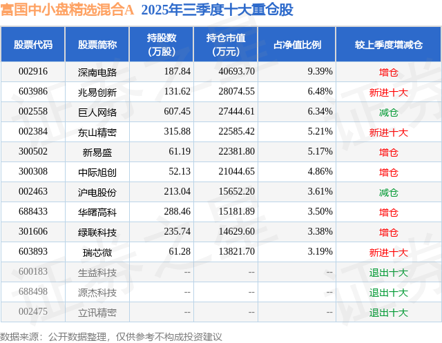 根据2025基金Q3季报公募基金重仓股数据,重仓该股的公募基金共10家,其中持有数量最多的公募基金为富国基金的富国中小盘精选混合A。富国中小盘精选混合A目前规模为17.29亿元,最新净值5.057(10月27日),较上一交易日上涨3.31%,近一年上涨96.54%。该公募基金现任基金经理为曹晋。曹晋在任的基金产品包括:富国通胀通缩主题轮动混合A,管理时间为2019年2月1日至今,期间收益率为375.05%;富国创业板两年定开混合,管理时间为2020年7月14日至今,期间收益率为76.03%;富国成长动力混合A,管理时间为2020年9月17日至今,期间收益率为50.88%。