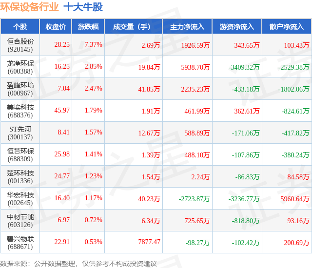 个股表现方面,环保设备行业当日领涨股为恒合股份(920145),该股当日报收28.25,上涨7.37%,成交量2.69万,主力资金净流入1926.59万元。龙净环保(600388)以上涨2.85%紧随其后,该股当日成交量19.84万,主力资金净流入5938.7万元。除此之外,盈峰环境(000967)、美埃科技(688376)、ST先河(300137)均进入当日牛股之列。具体个股列表见下表: