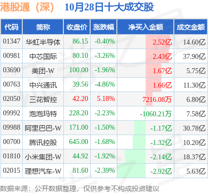 证券之星消息,10月28日,恒生指数跌0.33%,报收26346.14点。当日南向资金净买入22.583亿港元,交易所公布的港股通(深)十大成交股中,净买入个股共5只,净买入金额最多的是华虹半导体,净买入2.52亿港元,净卖出个股共5只,净卖出金额最多的是理想汽车-W,净卖出2.92亿港元。详情可见下表: