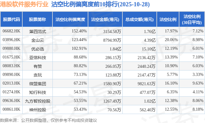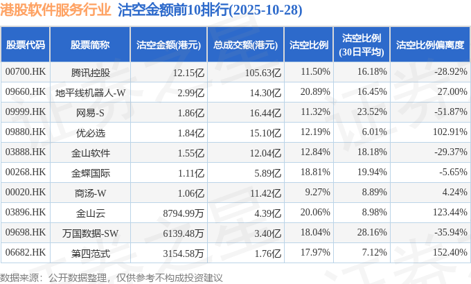 由于港股人民币柜台交易股票成交金额较小,沽空比例普遍偏高,为了避免干扰,已将人民币柜台交易股票从排行表格中剔除。