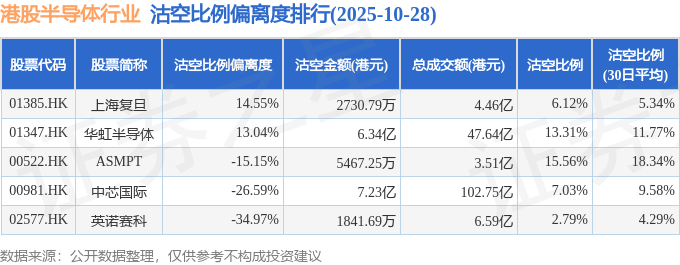 从沽空比例来看,ASMPT、华虹半导体、中芯国际沽空比例位居行业前三,分别为15.56%、13.31%、7.03%。