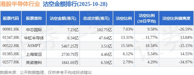 从沽空金额来看,中芯国际、华虹半导体、ASMPT沽空金额位居行业前三,分别为7.23亿港元、6.34亿港元、5467.25万港元。