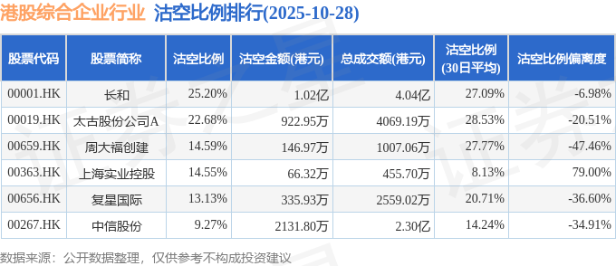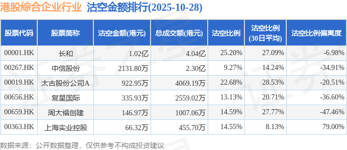 从沽空金额来看,长和、中信股份、太古股份公司A沽空金额位居行业前三,分别为1.02亿港元、2131.8万港元、922.95万港元。