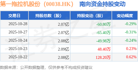 证券之星消息,10月28日南向资金减持60.8万股第一拖拉机股份(00038.HK)。近5个交易日中,获南向资金增持的有2天,累计净增持4207.0股。近20个交易日中,获南向资金增持的有11天,累计净增持97.82万股。截至目前,南向资金持有第一拖拉机股份(00038.HK)2.07亿股,占公司已发行普通股的52.75%。