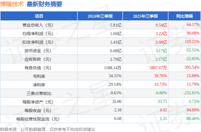 据证券之星公开数据整理,近期博隆技术(603325)发布2025年三季报。截至本报告期末,公司营业总收入9.54亿元,同比上升64.17%,归母净利润3.22亿元,同比上升90.08%。按单季度数据看,第三季度营业总收入2.29亿元,同比上升7.31%,第三季度归母净利润7952.25万元,同比上升12.39%。本报告期博隆技术盈利能力上升,毛利率同比增幅15.89%,净利率同比增幅15.79%。