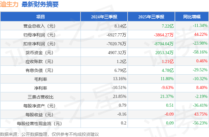 据证券之星公开数据整理,近期迪生力(603335)发布2025年三季报。根据财报显示,迪生力亏损收窄。截至本报告期末,公司营业总收入7.22亿元,同比下降11.34%,归母净利润-3864.27万元,同比上升44.22%。按单季度数据看,第三季度营业总收入2.18亿元,同比下降7.1%,第三季度归母净利润1915.64万元,同比上升145.85%。