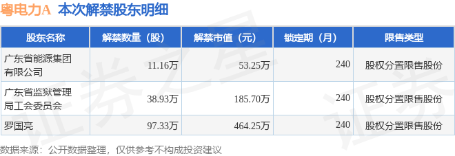 证券之星消息,根据市场公开信息整理,粤电力A(000539)于10月29日将有147.42万股限售股份解禁,为公司股权分置限售股份,占公司总股本0.03%。(本次数据根据历史公告整理得出,实际情况以上市公司最新公告为准)本次解禁后,公司还有18.96亿股限售股份,占总股本36.12%。具体如下图所示: