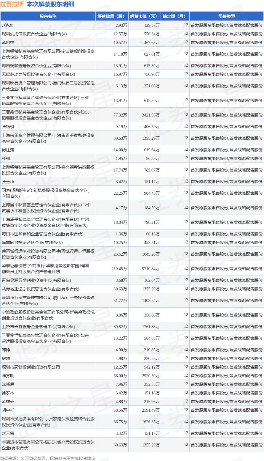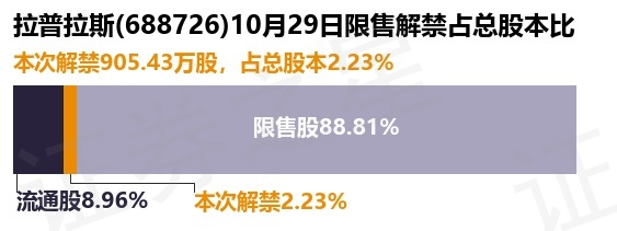 证券之星消息,根据市场公开信息整理,拉普拉斯(688726)于10月29日将有905.43万股限售股份解禁,为公司首发原股东限售股份,首发战略配售股份,占公司总股本2.23%。(本次数据根据历史公告整理得出,实际情况以上市公司最新公告为准)最近一年内,该股累计解禁258.0万股,占总股本的0.64%。本次解禁后,公司还有3.6亿股限售股份,占总股本88.81%。具体如下图所示: