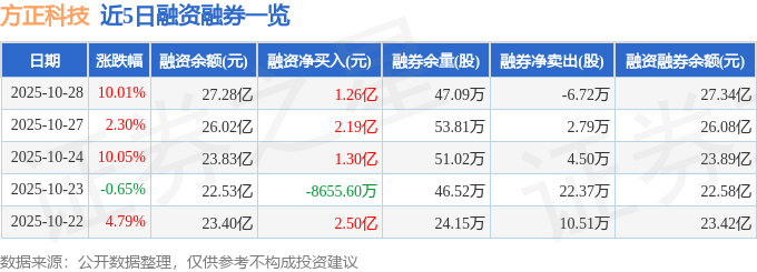 方正科技融资融券信息显示,融资方面,当日融资买入7.95亿元,融资偿还6.69亿元,融资净买入1.26亿元,连续3日净买入累计4.75亿元。融券方面,融券卖出7.84万股,融券偿还14.56万股,融券余量47.09万股,融券余额621.12万元。融资融券余额27.34亿元。