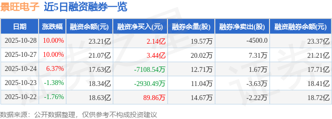 景旺电子融资融券信息显示,融资方面,当日融资买入6.15亿元,融资偿还4.01亿元,融资净买入2.14亿元,净买入额两市排名第8。融券方面,融券卖出3.06万股,融券偿还3.51万股,融券余量19.57万股,融券余额1510.61万元。融资融券余额23.37亿元。
