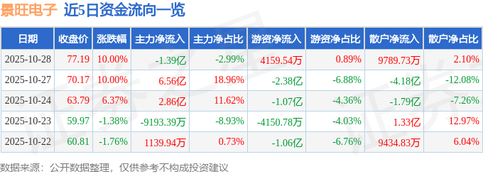 证券之星消息,截至2025年10月28日收盘,景旺电子(603228)报收于77.19元,上涨10.0%,已连续涨停2天,换手率6.38%,成交量62.29万手,成交额46.63亿元。