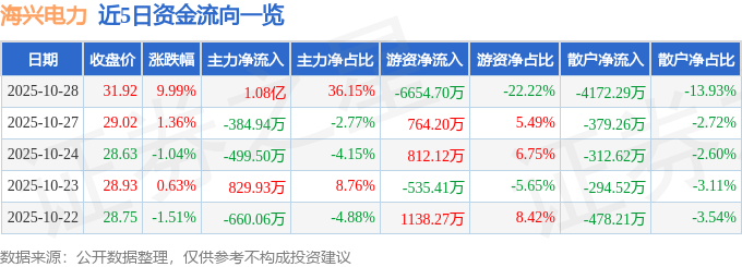 证券之星消息,截至2025年10月28日收盘,海兴电力(603556)报收于31.92元,上涨9.99%,涨停,换手率1.93%,成交量9.39万手,成交额3.0亿元。