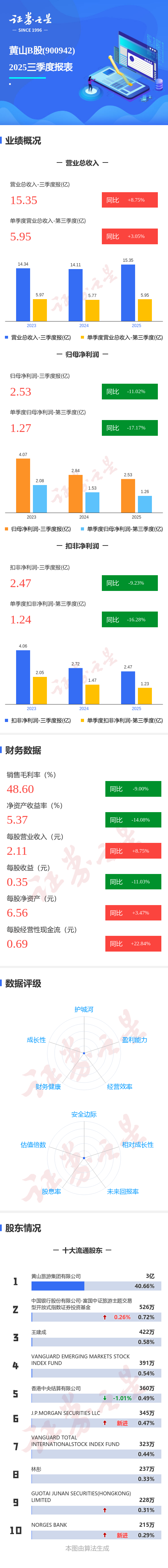 证券之星消息,黄山B股2025年三季报显示,公司主营收入15.35亿元,同比上升8.75%;归母净利润2.53亿元,同比下降11.02%;扣非净利润2.47亿元,同比下降9.23%;其中2025年第三季度,公司单季度主营收入5.95亿元,同比上升3.05%;单季度归母净利润1.27亿元,同比下降17.17%;单季度扣非净利润1.24亿元,同比下降16.29%;负债率15.52%,投资收益-1283.25万元,财务费用363.17万元,毛利率48.6%。