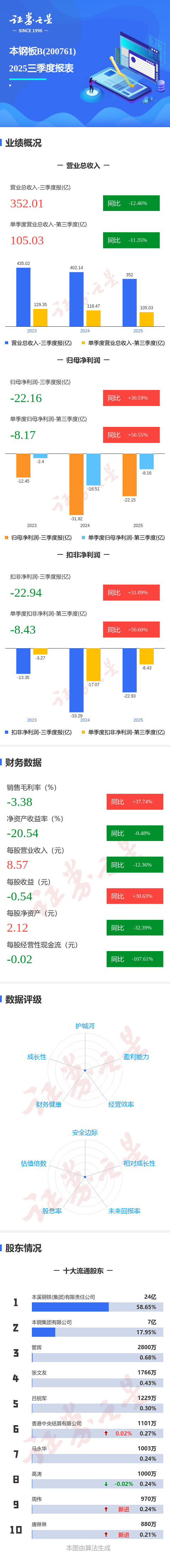 证券之星消息,本钢板B2025年三季报显示,公司主营收入352.01亿元,同比下降12.47%;归母净利润-22.16亿元,同比上升30.6%;扣非净利润-22.94亿元,同比上升31.1%;其中2025年第三季度,公司单季度主营收入105.03亿元,同比下降11.35%;单季度归母净利润-8.17亿元,同比上升50.56%;单季度扣非净利润-8.43亿元,同比上升50.6%;负债率78.0%,投资收益-2269.55万元,财务费用2.95亿元,毛利率-3.38%。
