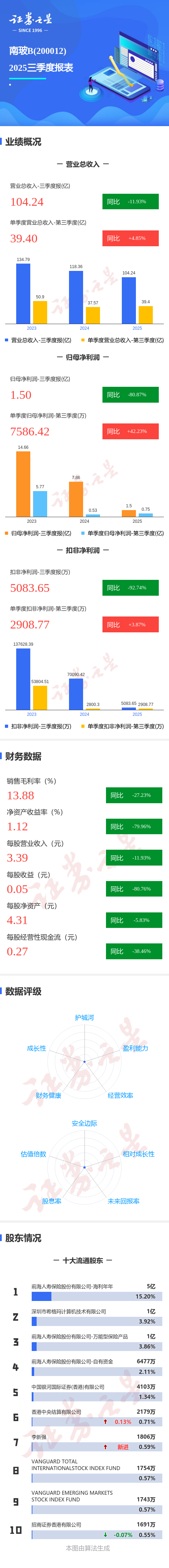 证券之星消息,南玻B2025年三季报显示,公司主营收入104.24亿元,同比下降11.94%;归母净利润1.5亿元,同比下降80.88%;扣非净利润5083.65万元,同比下降92.75%;其中2025年第三季度,公司单季度主营收入39.4亿元,同比上升4.86%;单季度归母净利润7586.42万元,同比上升42.23%;单季度扣非净利润2908.77万元,同比上升3.87%;负债率56.17%,投资收益-1051.81万元,财务费用1.45亿元,毛利率13.88%。
