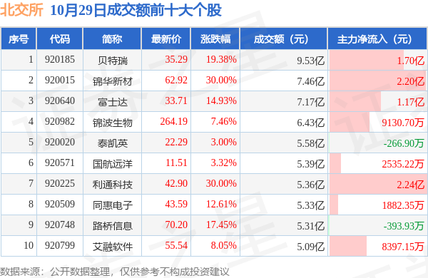当日北交所成交额前10大个股全线收涨,平均涨幅14.62%,其中贝特瑞(920185)以成交额9.53亿元排第一。从主力资金流入看,成交额前10大个股中有8只个股呈现主力资金净流入。