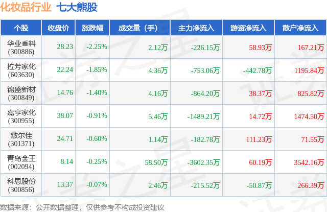 个股表现方面,化妆品行业当日领跌股为华业香料(300886),该股当日报收28.23,下跌2.25%,成交量2.12万,主力资金净流出226.15万元。拉芳家化(603630)以下跌1.85%紧随其后,该股当日成交量4.36万,主力资金净流出753.06万元。除此之外,锦盛新材(300849)、嘉亨家化(300955)、敷尔佳(301371)均进入当日熊股之列。具体个股列表见下表: