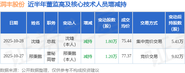 证券之星消息,根据10月29日市场公开信息、上市公司公告及交易所披露数据整理,润丰股份(301035)最新董监高及相关人员股份变动情况:2025年10月28日公司总裁沈婕共减持公司股份1.8万股,占公司总股本为0.0064%。变动期间公司股价下跌0.3%,10月28日当日收盘报75.62元。
