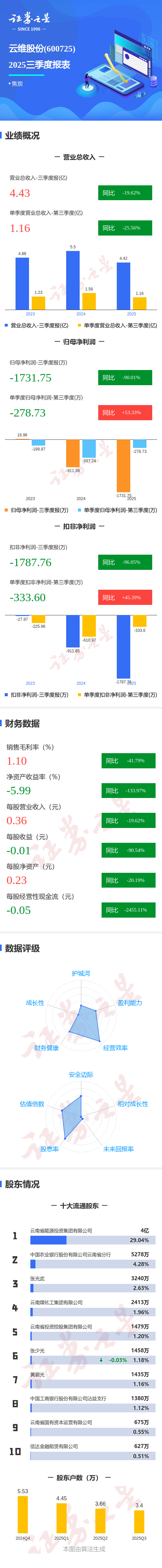 证券之星消息,云维股份2025年三季报显示,前三季度公司主营收入4.43亿元,同比下降19.62%;归母净利润-1731.75万元,同比下降90.01%;扣非净利润-1787.76万元,同比下降96.06%;其中2025年第三季度,公司单季度主营收入1.16亿元,同比下降25.56%;单季度归母净利润-278.73万元,同比上升53.33%;单季度扣非净利润-333.6万元,同比上升45.4%;负债率18.87%,投资收益81.19万元,财务费用34.62万元,毛利率1.1%。
