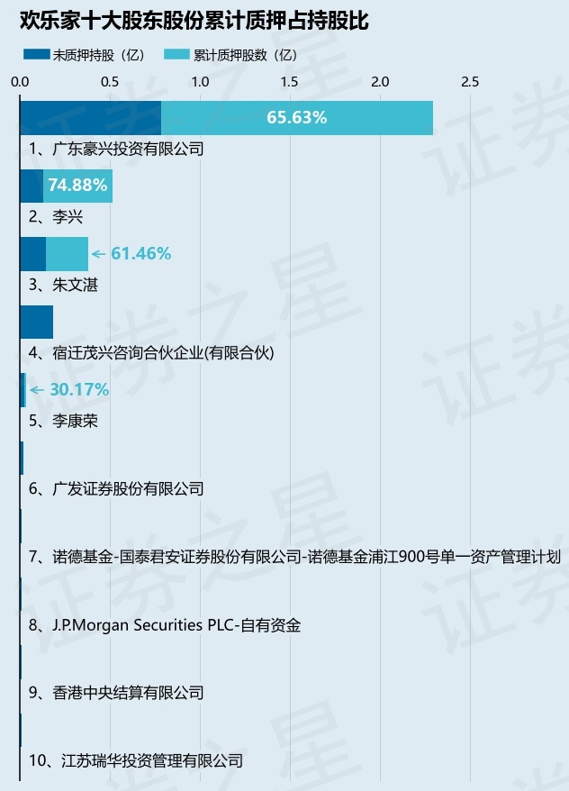截止本公告日,股东广东豪兴投资有限公司已累计质押股份1.51亿股,占其持股总数的65.63%,股东李兴已累计质押股份3870.0万股,占其持股总数的74.88%,股东朱文湛已累计质押股份2343.0万股,占其持股总数的61.46%,股东李康荣已累计质押股份115.0万股,占其持股总数的30.17%。本次质押后欢乐家十大股东的累计质押股份占持股比例(占持股比例的计算以公司最新一期财务报表公布的十大股东的持股总数为基准)见下图: