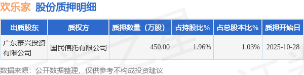 证券之星消息,欢乐家(300997)10月29日公开信息显示,股东广东豪兴投资有限公司向国民信托有限公司合计质押450.0万股,占总股本1.03%。质押详情见下表: