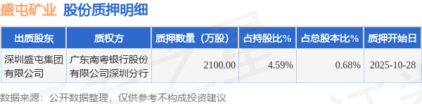 证券之星消息,盛屯矿业(600711)10月29日公开信息显示,股东深圳盛屯集团有限公司向广东南粤银行股份有限公司深圳分行合计质押2100.0万股,占总股本0.68%。质押详情见下表: