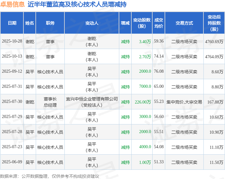 卓易信息近半年内的董监高及核心技术人员增减持详情如下: