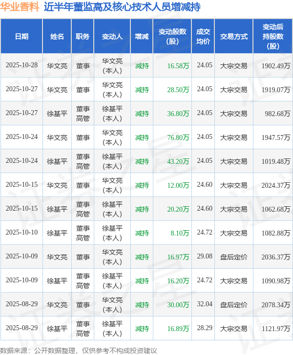华业香料近半年内的董监高及核心技术人员增减持详情如下: