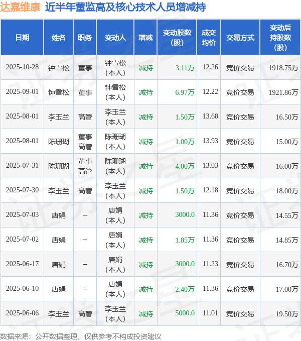 达嘉维康近半年内的董监高及核心技术人员增减持详情如下: