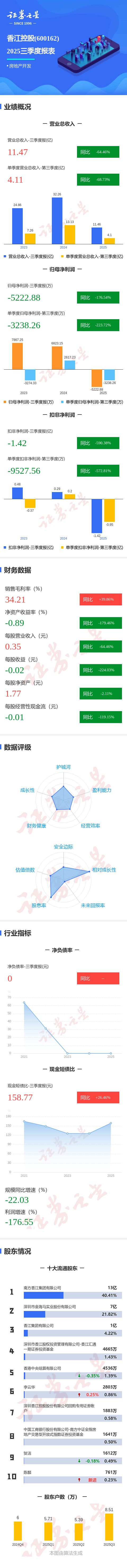 证券之星消息,香江控股2025年三季报显示,前三季度公司主营收入11.47亿元,同比下降64.46%;归母净利润-5222.88万元,同比下降176.55%;扣非净利润-1.42亿元,同比下降590.39%;其中2025年第三季度,公司单季度主营收入4.11亿元,同比下降68.74%;单季度归母净利润-3238.26万元,同比下降223.73%;单季度扣非净利润-9527.56万元,同比下降572.81%;负债率66.12%,投资收益-85.32万元,财务费用1.7亿元,毛利率34.21%。