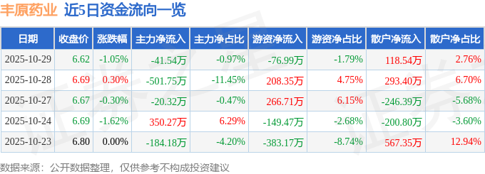证券之星消息,截至2025年10月29日收盘,丰原药业(000153)报收于6.62元,下跌1.05%,换手率1.44%,成交量6.51万手,成交额4302.15万元。