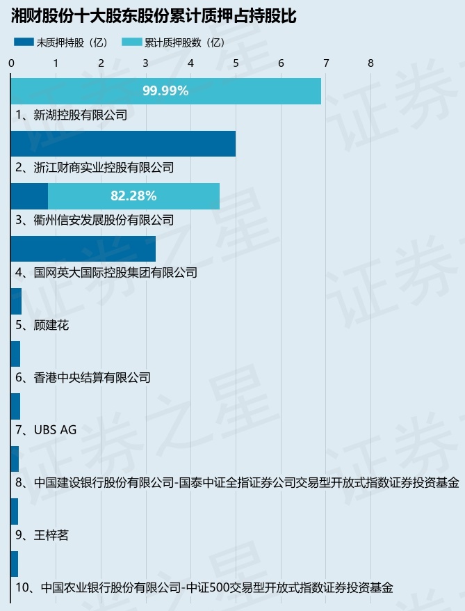 截止本公告日,股东新湖控股有限公司已累计质押股份6.9亿股,占其持股总数的99.99%,股东衢州信安发展股份有限公司已累计质押股份3.82亿股,占其持股总数的82.28%。本次质押后湘财股份十大股东的累计质押股份占持股比例(占持股比例的计算以公司最新一期财务报表公布的十大股东的持股总数为基准)见下图: