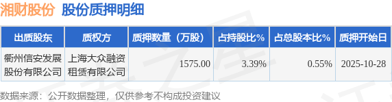 证券之星消息,湘财股份(600095)10月30日公开信息显示,股东衢州信安发展股份有限公司向上海大众融资租赁有限公司合计质押1575.0万股,占总股本0.55%。质押详情见下表:
