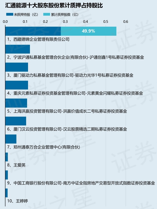 截止本公告日,股东西藏德锦企业管理有限责任公司已累计质押股份2760.0万股,占其持股总数的49.9%。本次质押后汇通能源十大股东的累计质押股份占持股比例(占持股比例的计算以公司最新一期财务报表公布的十大股东的持股总数为基准)见下图: