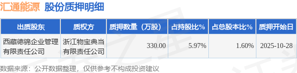 证券之星消息,汇通能源(600605)10月30日公开信息显示,股东西藏德锦企业管理有限责任公司向浙江物宝典当有限责任公司合计质押330.0万股,占总股本1.6%。质押详情见下表: