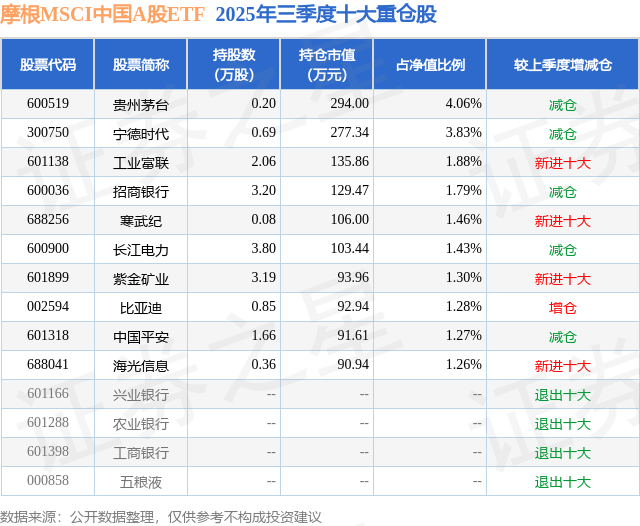 从基金规模来看,摩根MSCI中国A股ETF基金2025年三季度公布的基金规模为0.72亿元,较上一期规模8196.78万元变化了-959.87万元,环比变化了-11.71%。该基金最新一期资产配置为:股票占净值比99.68%,无债券类资产,现金占净值比0.44%。从基金持仓来看,该基金当季前十大股票仓位达19.56%,第一大重仓股为贵州茅台(600519),持仓占比为4.06%。