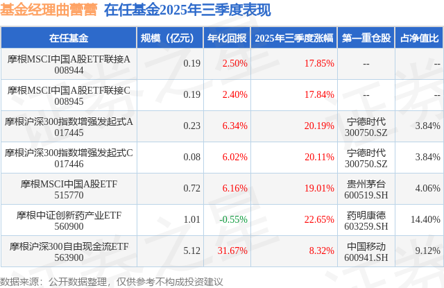 摩根MSCI中国A股ETF现任基金经理为曲蕾蕾。其中在任基金经理曲蕾蕾已从业0年又8天,2025年10月22日正式接手管理摩根MSCI中国A股ETF,任职期间累计回报为1.94%。目前还管理着7只基金产品(包括A类和C类),其中本季度表现最佳的基金为摩根中证创新药产业ETF(560900),季度净值涨幅为22.65%。