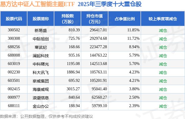 从基金规模来看,易方达中证人工智能主题ETF基金2025年三季度公布的基金规模为250.04亿元,较上一期规模165.78亿元变化了84.26亿元,环比变化了50.83%。该基金最新一期资产配置为:股票占净值比99.7%,无债券类资产,现金占净值比0.76%。从基金持仓来看,该基金当季前十大股票仓位达61.13%,第一大重仓股为新易盛(300502),持仓占比为11.85%。