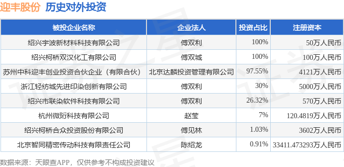 证券之星消息,根据天眼查APP显示,迎丰股份(605055.SH)新增一起对外投资事件,被投资公司为苏州中科迎丰创业投资合伙企业(有限合伙),法定代表人北京达麟投资管理有限公司,投资占比为97.55%。该公司从事资本市场服务,注册资本为4121万人民币。目前,迎丰股份共存在对外投资8项,详见下表: