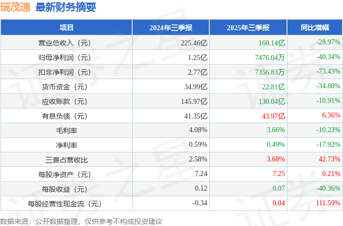 据证券之星公开数据整理,近期瑞茂通(600180)发布2025年三季报。截至本报告期末,公司营业总收入160.14亿元,同比下降28.97%,归母净利润7476.04万元,同比下降40.34%。按单季度数据看,第三季度营业总收入65.51亿元,同比下降19.83%,第三季度归母净利润1781.87万元,同比上升149.52%。本报告期瑞茂通短期债务压力上升,流动比率达0.82。