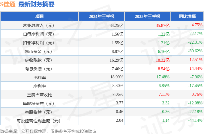 据证券之星公开数据整理,近期S佳通(600182)发布2025年三季报。截至本报告期末,公司营业总收入35.87亿元,同比上升4.75%,归母净利润1.22亿元,同比下降22.17%。按单季度数据看,第三季度营业总收入13.0亿元,同比上升4.72%,第三季度归母净利润6492.01万元,同比下降2.46%。本报告期S佳通公司应收账款体量较大,当期应收账款占最新年报归母净利润比达1051.38%。