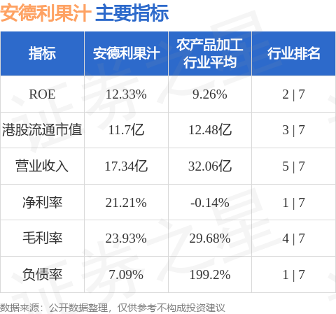 安德利果汁港股市值11.7亿港元,在农产品加工行业中排名第3。主要指标见下表: