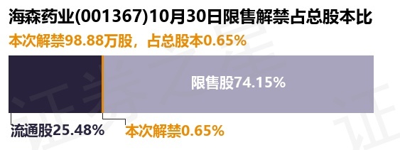 证券之星消息,根据市场公开信息整理,海森药业(001367)于10月30日将有98.88万股限售股份解禁,为公司股权激励限售股份,占公司总股本0.65%。(本次数据根据历史公告整理得出,实际情况以上市公司最新公告为准)本次解禁后,公司还有1.13亿股限售股份,占总股本74.15%。具体如下图所示: