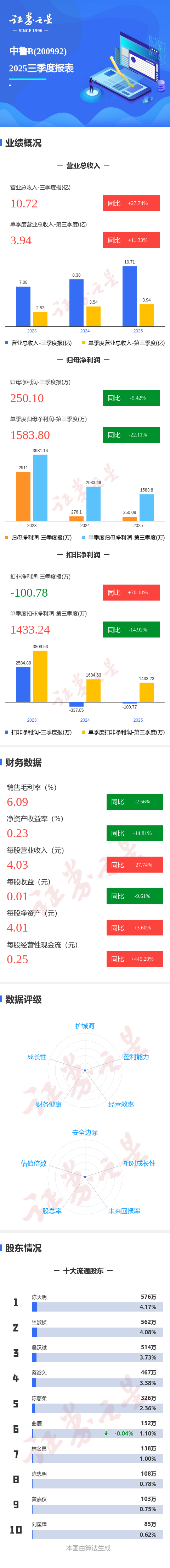证券之星消息,中鲁B2025年三季报显示,前三季度公司主营收入10.72亿元,同比上升27.74%;归母净利润250.1万元,同比下降9.42%;扣非净利润-100.78万元,同比上升70.1%;其中2025年第三季度,公司单季度主营收入3.94亿元,同比上升11.33%;单季度归母净利润1583.8万元,同比下降22.11%;单季度扣非净利润1433.24万元,同比下降14.92%;负债率36.14%,投资收益-25.82万元,财务费用829.91万元,毛利率6.09%。