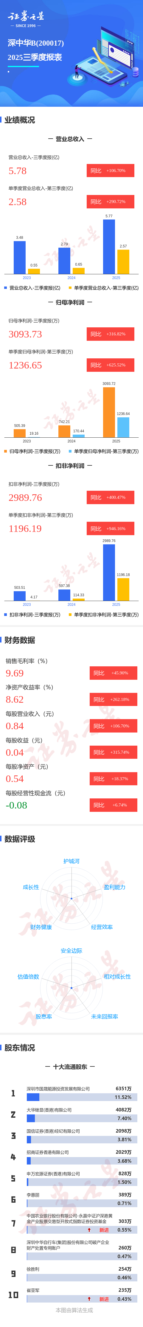 证券之星消息,深中华B2025年三季报显示,前三季度公司主营收入5.78亿元,同比上升106.71%;归母净利润3093.73万元,同比上升316.82%;扣非净利润2989.76万元,同比上升400.48%;其中2025年第三季度,公司单季度主营收入2.58亿元,同比上升290.72%;单季度归母净利润1236.65万元,同比上升625.52%;单季度扣非净利润1196.19万元,同比上升946.17%;负债率17.68%,财务费用50.05万元,毛利率9.69%。