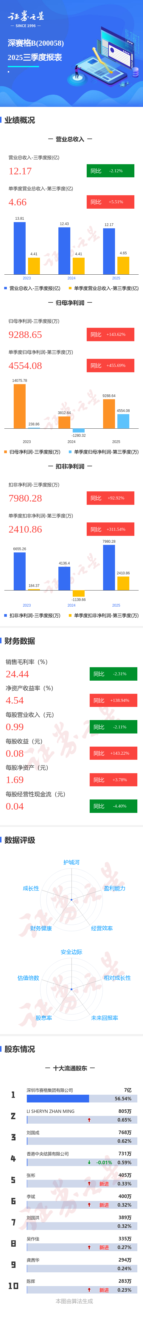 证券之星消息,深赛格B2025年三季报显示,前三季度公司主营收入12.17亿元,同比下降2.12%;归母净利润9288.65万元,同比上升143.63%;扣非净利润7980.28万元,同比上升92.93%;其中2025年第三季度,公司单季度主营收入4.66亿元,同比上升5.51%;单季度归母净利润4554.08万元,同比上升455.7%;单季度扣非净利润2410.86万元,同比上升311.54%;负债率50.14%,投资收益-1308.09万元,财务费用2505.8万元,毛利率24.44%。
