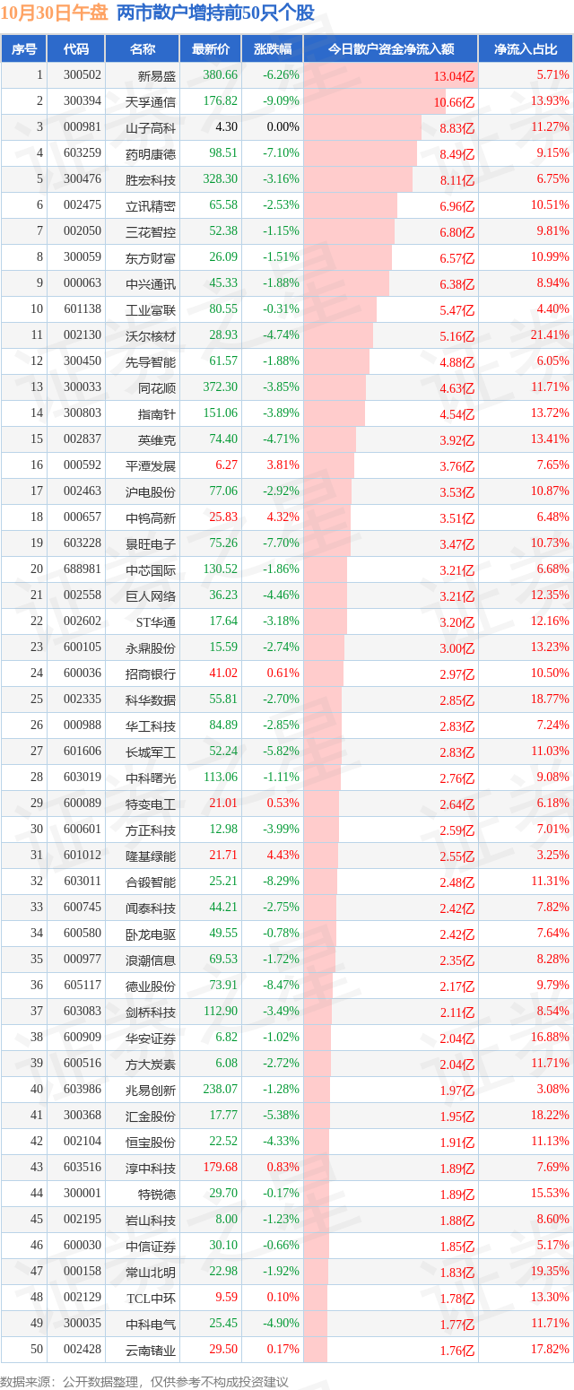 两市散户增持最多的前十只个股为:
