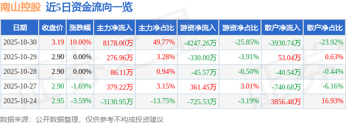 证券之星消息,南山控股10月30日涨停收盘,收盘价3.19元。该股于9点30分涨停,未打开涨停,截止收盘封单资金为6505.43万元,占其流通市值1.52%。